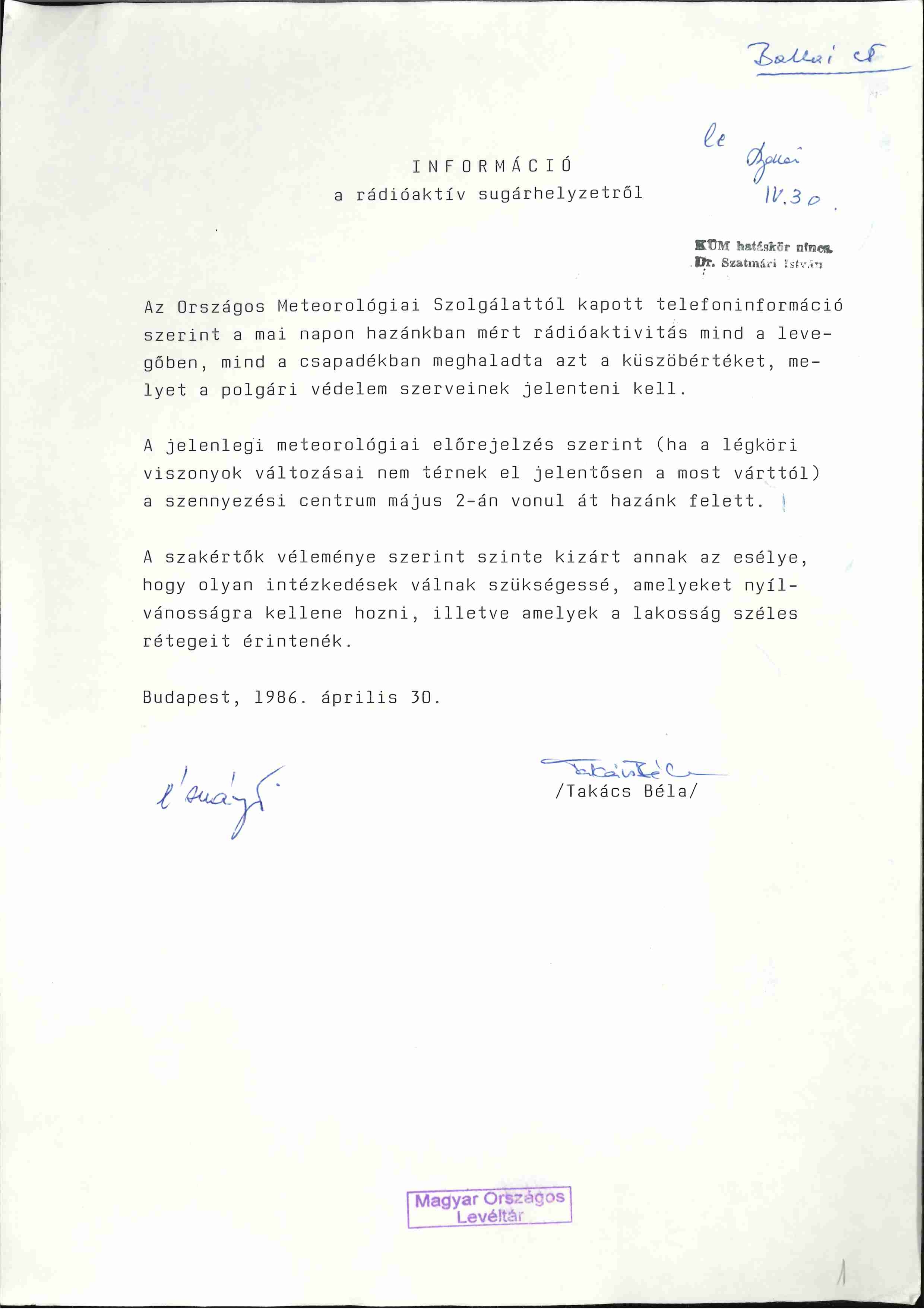 [52] HU-MNL-OL-M-KS 288-24-1986-2. „Információ a rádióaktív [sic!] sugárhelyzetről”, 1986. április 30. 1.