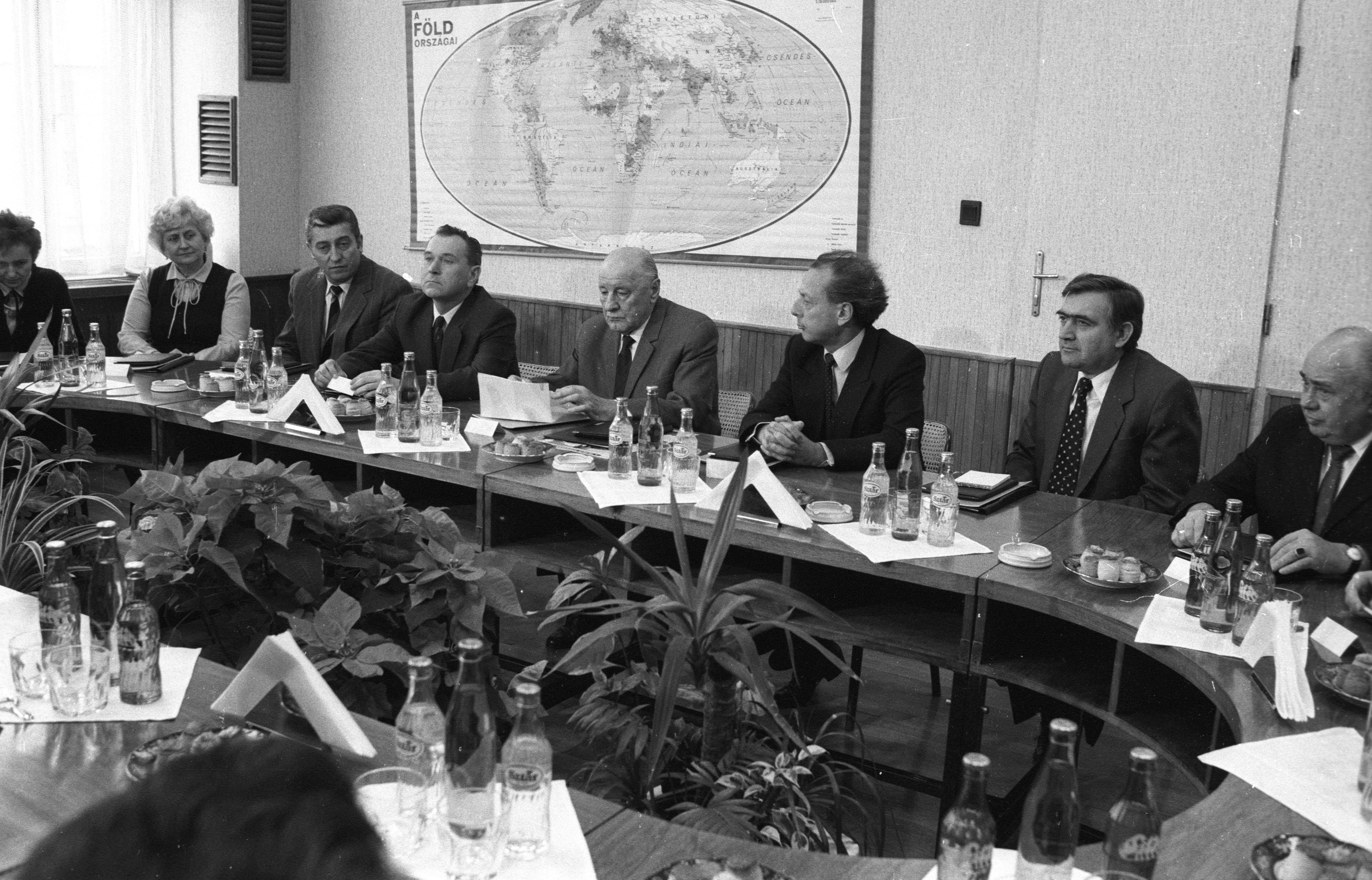 Kádár János a Taurus Gumiipari Vállalat Tanácstermében (1987). A bal oldalán Kapolyi László.