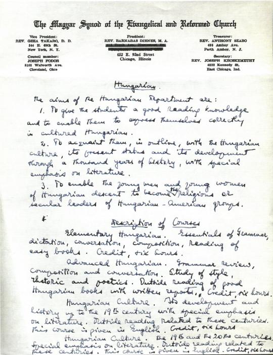 1. Dr. Dienes Barnabás tiszteletes kézzel írott programterve az Elmhurst College magyar programja számára