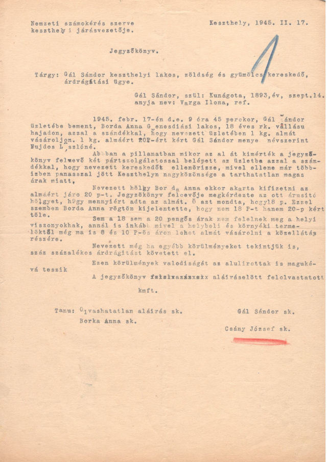 Jegyzőkönyv Gaál Sándor árdrágítási ügyében