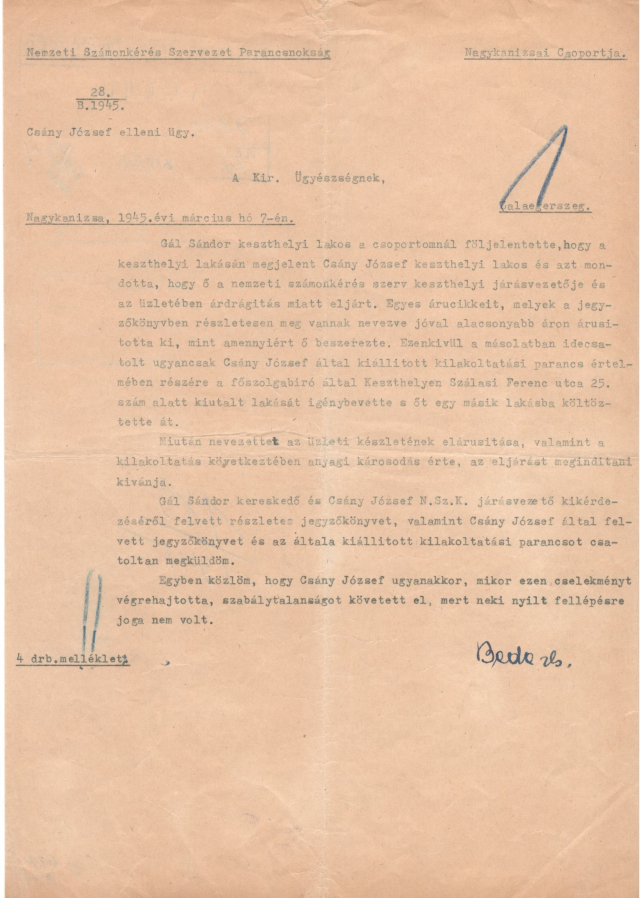 Az irat jelzete: HU-MNL-ZML-XXV.16.b.-61/1946 ‒ Magyar Nemzeti Levéltár Zala Megyei Levéltára, A jogszolgáltatás területi szervei, Nagykanizsai Népbíróság iratai, Népbírósági perek, Csány József népellenes bűntette.