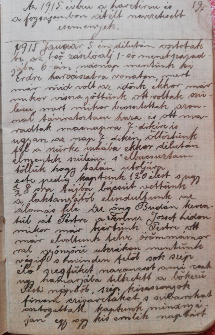 Az első világháború kitöréséhez vezető politikai és katonai döntések nem csupán a szembenálló felek viszonyára vagy a harcok kimenetelére voltak hatással, hanem azokra is, akiknek az életébe szó szerint „berobbant” a háború. A múlt században élt üknagyapám, Damásdi Imre (1893‒1977) először a keleti fronton harcoló katonaként, majd pedig hadifogolyként volt érintett ebben a konfliktusban. Az általa megélt eseményeket – a visszaemlékezéseket is tartalmazó – naplójában örökítette meg, amely betekintést nyújt az 1915 januárjában Bukovinában zajló harcokba.