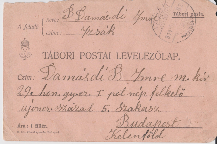 Egy 1914. december 8-án kelt, ükapámnak írt levél[17] címzéséből kiderül, hogy Damásdi Imre a m. kir. 29. (budapesti) honvéd gyalogezred 1. pótszázadának népfelkelő gyalogosaként vonult be, laktanyája Kelenföldön volt.