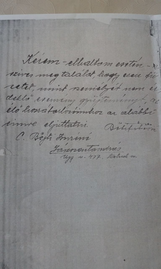 Kérem elhaltam esetén a szíves megtalálót, hogy ezen füzetet, mint személyét nem érdeklő esemény gyűjteményt, az élő hozzátartozóimhoz az alábbi címre eljuttatni.