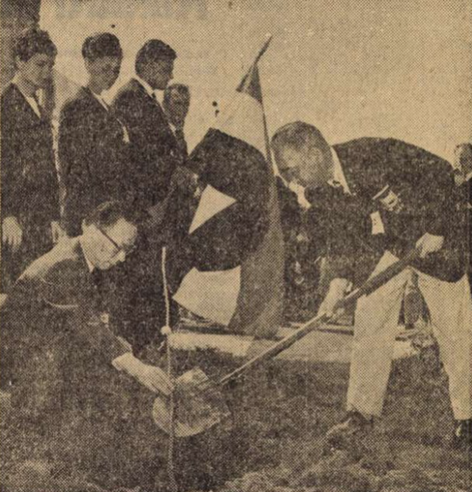 Josida nagykövet (balról) és Takeda Josinori herceg (jobbról) facsemetét ültetnek Budapesten a japán–magyar sportbarátság szimbólumaként 1965-ben.