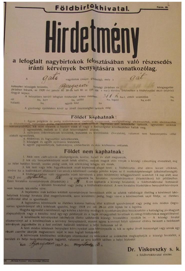 Mint annyi más község, mi sem kaptunk a cseh földreform során földet, hanem némán kellett tűrnünk, hogy színmagyar községünkbe cseheket telepítenek. Ezek a telepítések, valamint a létesített maradékbirtokok elvették a községtől a természetes terjeszkedés lehetőségét, ezért arra kérjük Nagyméltóságodat, hogy ezen földterületek, illetve beépített házhelyek eléréséhez hozzásegíteni méltóztassék. […]