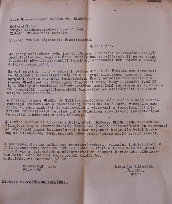 Utasítás a községi tanács végrehajtó bizottsága számára zöldségtermelési szerződéskötések tárgyában, 1950. december 22.