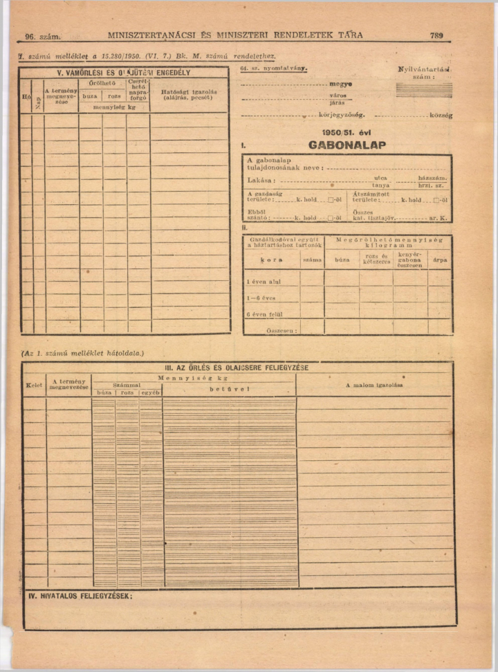 1950/51. évi gabonalap. Forrás: 15.280/1950. (VI.7.) Bk.M. számú rendelete a vámőrlési jogosultság szabályozása és a gabonalap kiadása tárgyában.