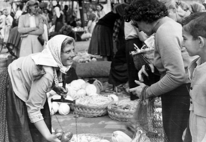 Nagykanizsa, piactér a Zrínyi Miklós utca és Zárda utca találkozásánál, 1955.