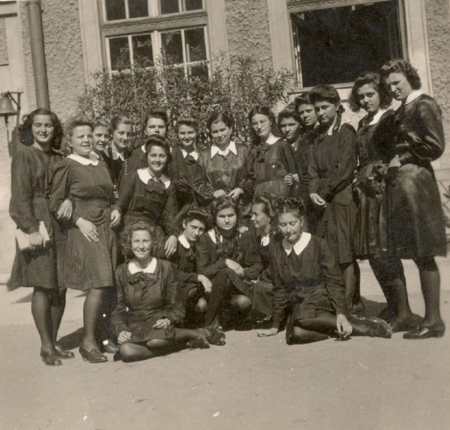 Tucsi osztálytársaival a kolozsvári Református Leánygimnázium udvarán 1942 szeptemberében