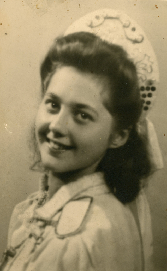Azt ígértem neked, hogy a következő levelemben küldöm a fényképet. IV. gimnáziumban konfirmáltam, 1940. május 2-án, és akkor készült ez a kép. A ruhát mi csináltuk: a pruszlikom színes pamuttal van kivarrva, az alja és az ujja fehér grenadin. Világos testszínű harisnya van hozzá. […] Ne haragudj, hogy ilyen sokat és csúnyán írok. Sokat kaptam már, hogy milyen csúnyán írok, de nem tehetek róla. Mindig szépen akarok írni, és mindig csúnya lesz. […]